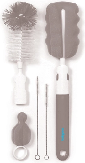 Set practic pentru igiena zilnică a accesoriilor pentru bebeluși: perie pentru sticle cu două vârfuri interschimbabile (peri moi și burete elastic) și burete pentru suzete. Datorită orificiului pentru agățare se usucă rapid, mânerul ergonomic asigură o prindere sigură, iar materialele sigure fără BPA protejează sănătatea copilului tău.