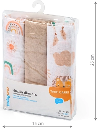 Scutecele din muselină BABYONO Super Soft oferă confort și finețe pe care te poți baza zi de zi. Bumbacul în două straturi este excepțional de aerisit, astfel încât bebelușul rămâne în confort atât vara, cât și acasă după baie. Datorită dimensiunilor universale de 70 × 70 cm sunt potrivite pentru înfășat, protecție la eructat, ca păturică ușoară, cearșaf pentru cărucior și acoperire discretă la alăptare.