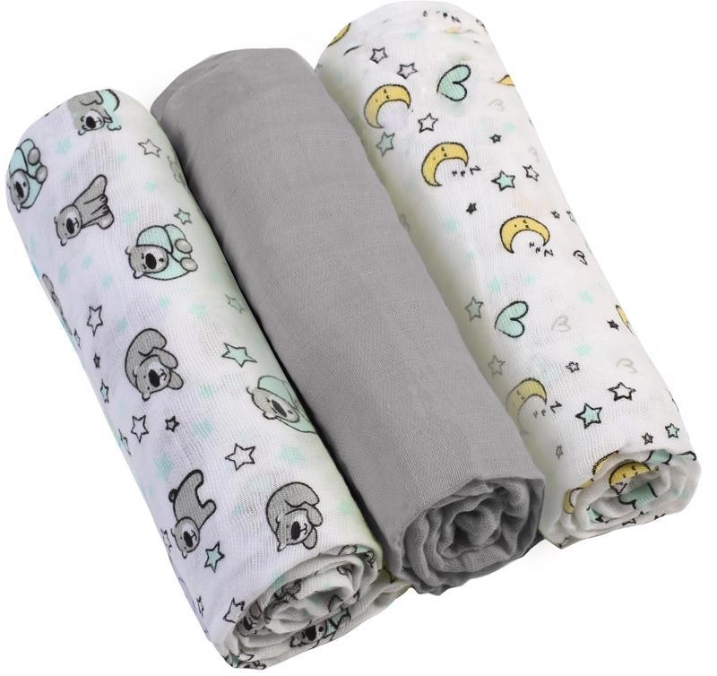 Utilizarea versatilă te ajută zi de zi – de la înfășat și liniștirea bebelușului până la acoperirea căruciorului sau alăptarea discretă. Setul conține 3 bucăți, fiecare de 70 × 70 cm, două cu imprimeu decorativ în tonuri neutre de gri, potrivite atât pentru fetițe, cât și pentru băieței.