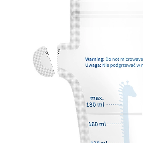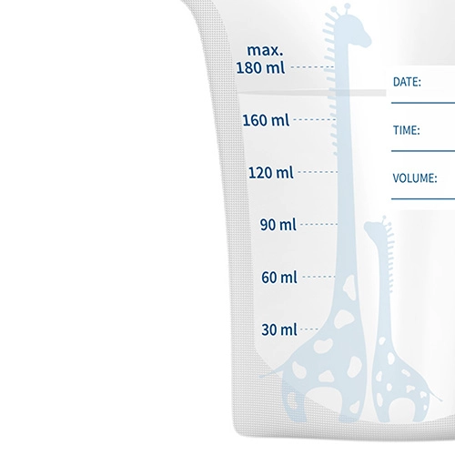 Gura de turnare practică simplifică transferul precis și curat al laptelui în biberon. Pe partea din față se află o scară clară până la 180 ml și un câmp pentru notițe cu data și ora colectării. Pungile sunt sterilizate cu radiații gamma, asigurând un nivel înalt de igienă pentru bebelușul dvs.