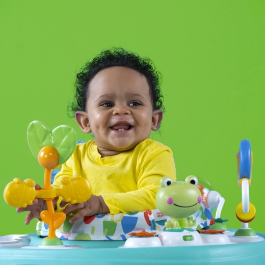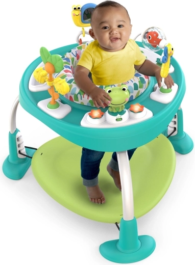 Bebelușul ajunge cu ușurință la toate jucăriile, se poate roti, întinde și exersa coordonarea și stabilitatea în timp ce sare în siguranță.