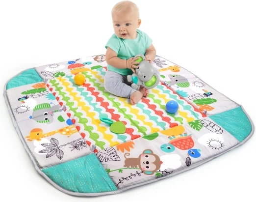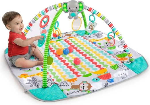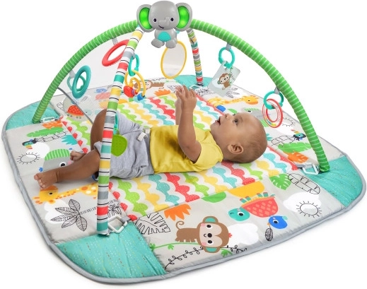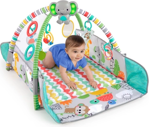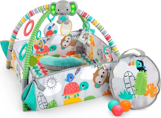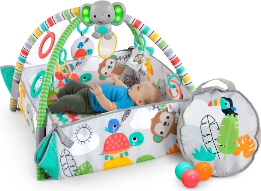 Include elefant muzical cu lumini (peste 20 de minute de muzică), oglindă sigură, carduri colorate, jucărie de dentiție în formă de frunză și zornăitoare cu mărgele. Pentru stat confortabil pe burtică, nu lipsește pernuța de sprijin. Pătura este moale, ușor de întreținut și, datorită husei pentru mingi, este ideală și pentru călătorii.