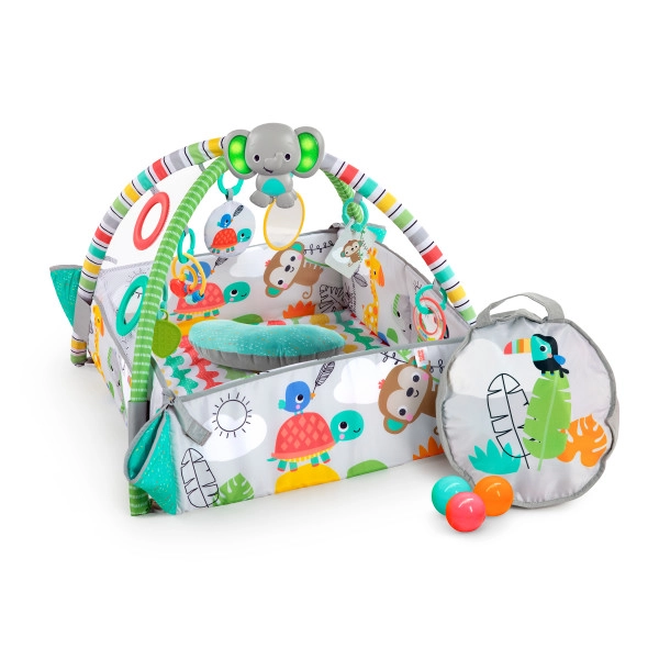 Această pătură de joacă multifuncțională BRIGHT STARTS Your Way Ball Play Totally Tropical transformă fiecare moment de relaxare într-o aventură senzorială. Datorită lateralelor reglabile, o poți transforma în câteva secunde într‑un țarc sau ball pit, iar mingile rămân frumos adunate. Două bare arcuite moi, cu jucării pe inele tip C, invită la întindere, prindere și observare și susțin motricitatea grosieră și fină.