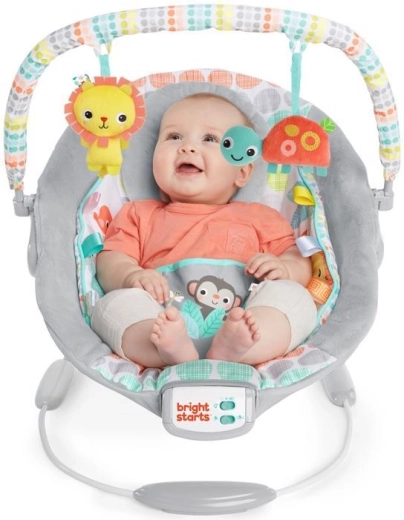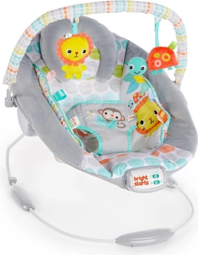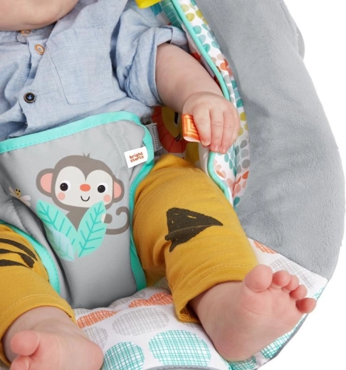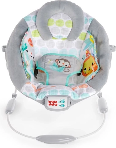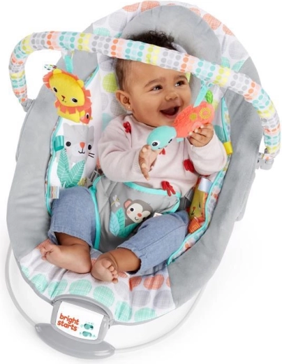 Șezlongul Bright Starts Whimsical Wild este conceput pentru confortul și distracția zilnică. Căptușeala moale, tetuiera detașabilă și insertul integrat pentru nou-născut oferă bebelușului susținerea adecvată. Vibrațiile liniștitoare și cele 7 melodii cu volum reglabil ajută la calmare și adormire, în timp ce temporizatorul de 15 minute economisește bateria.