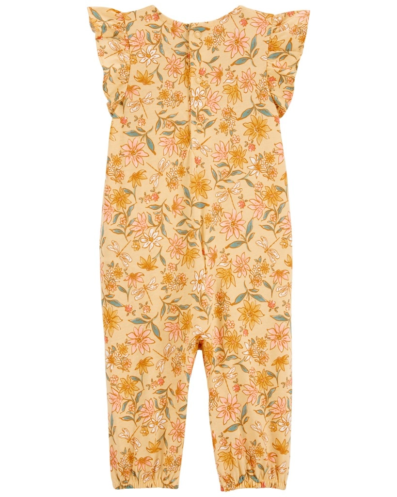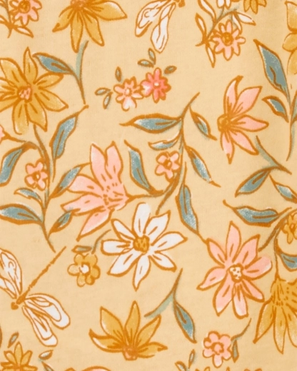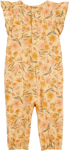 Drăguță salopetă pentru copii, fără botoșei, cu mânecă scurtă, într-un design floral galben deschis, ideală pentru purtare zilnică. Oferă material moale 100% bumbac, croială confortabilă și capse fără nichel, blânde cu pielea copilului.