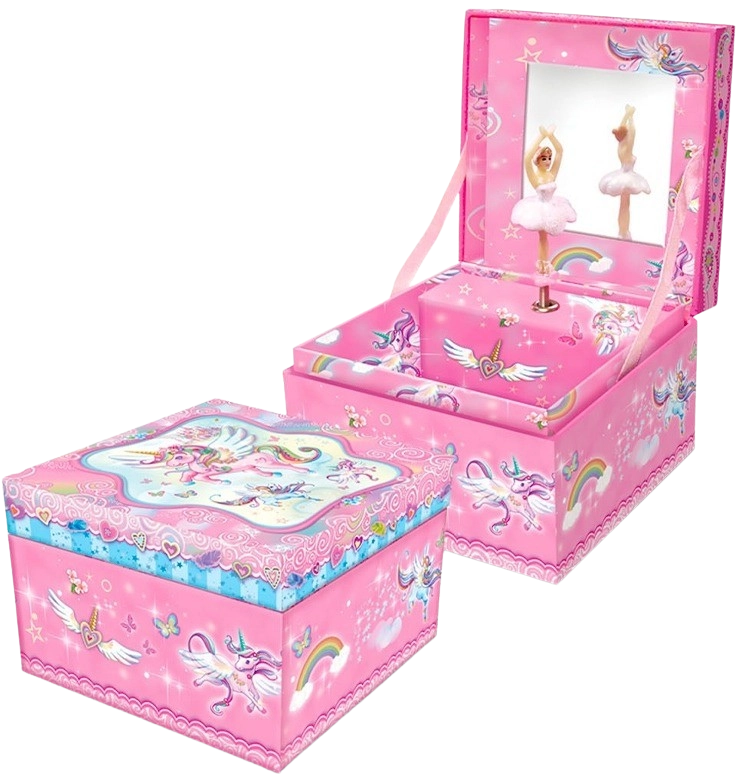 Această cutie de bijuterii încântătoare, cu culori delicate și finisaje detaliate, aduce copiilor bucurie și utilitate practică. La ridicarea capacului se activează mecanismul muzical cu o melodie plăcută, care completează atmosfera magică a motivului cu unicorn și balerină.