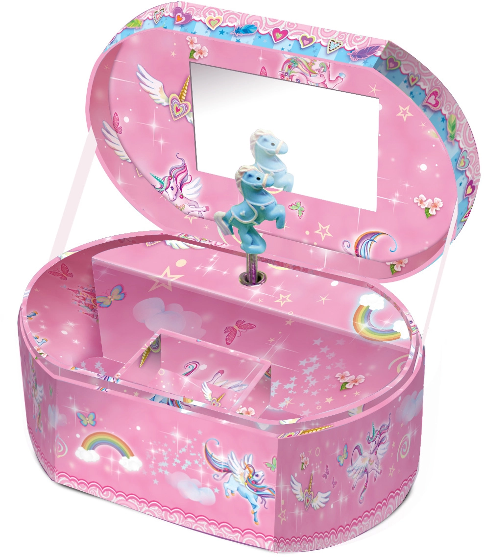 Cutița de bijuterii ovală, cu un unicorn adorabil, este concepută pentru copii de la 3 ani. La deschidere pornește o melodie plăcută, care adaugă o atmosferă magică fiecărei depozitări de bijuterii. Datorită materialelor de calitate, este rezistentă și durabilă, rămânând totodată ușoară pentru manevrare facilă.