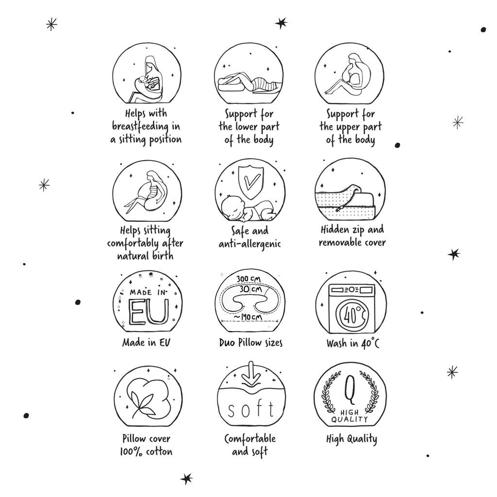 Datorită lungimii de 300 cm, perna creează un plăcut „cuib” care îmbunătățește poziționarea și ajută la relaxarea corpului. Forma literei mari „C” facilitează găsirea poziției corecte în timpul alăptării, ajută la reducerea tensiunii în umeri și susține poziția ergonomică a bebelușului.