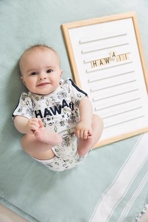 Închiderea cu capse în zona scutecului ușurează schimbarea, decolteul rotund și pantalonii scurți asigură confort pe tot parcursul zilei. Motivele estivale jucăușe și inscripția HAWAII dau ținutei un aspect plin de voie bună – perfectă pentru purtare zilnică.