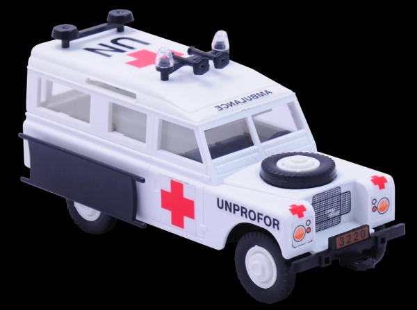 - Aspect autentic al ambulanței militare UNPROFOR pe șasiu Land Rover