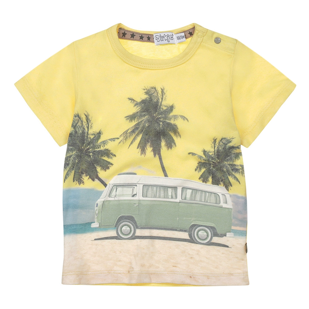 Tricou stilat pentru copii, într-o nuanță galbenă vibrantă, cu imprimeu de vară cu palmieri și dubiță retro, perfect pentru purtare zilnică. Oferă material moale și confortabil, închidere practică pe umăr pentru îmbrăcare ușoară și execuție de calitate pentru durabilitate îndelungată.