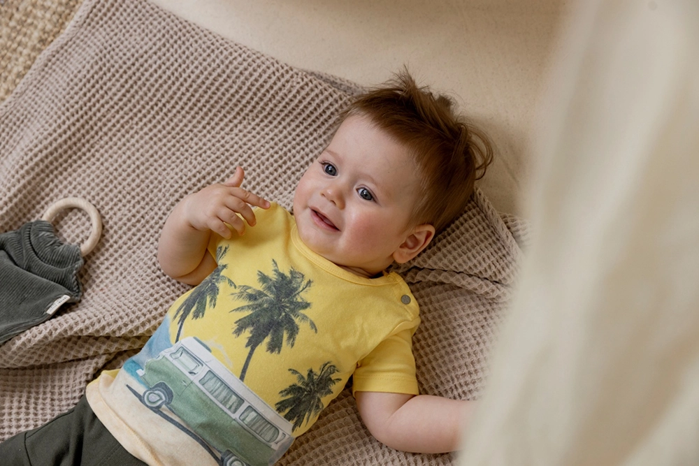 Bucurați-vă de vară în fiecare zi cu un tricou ușor și plăcut pentru micii aventurieri. Nuanța galbenă și motivul jucăuș de plajă oferă un look proaspăt, iar tricotul moale cu adaos de elastan asigură libertate de mișcare și confort pe tot parcursul zilei.