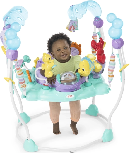 Vesela salteluță săltăreață cu tema MICA SIRENĂ transformă joaca într-o aventură „Under the Sea”. Prin sărituri active, copilul pornește efecte luminoase, sunete și muzică, care îl răsplătesc și îi stimulează simțurile și motricitatea. Scaunul rotativ permite accesul la toate jucăriile interactive, inclusiv la îndrăgitele personaje Sebastian și Flounder.