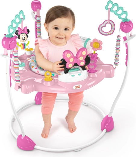Această salteluță distractivă cu tema MINNIE MOUSE transformă fiecare zi într-o descoperire plină de bucurie. Îl motivează pe copil la mișcare și la explorarea cauzei și efectului – cu cât sare mai mult, cu atât se activează mai multe lumini și melodii. Scaunul rotativ 360° asigură acces ușor la toate activitățile și jucăriile din jur.