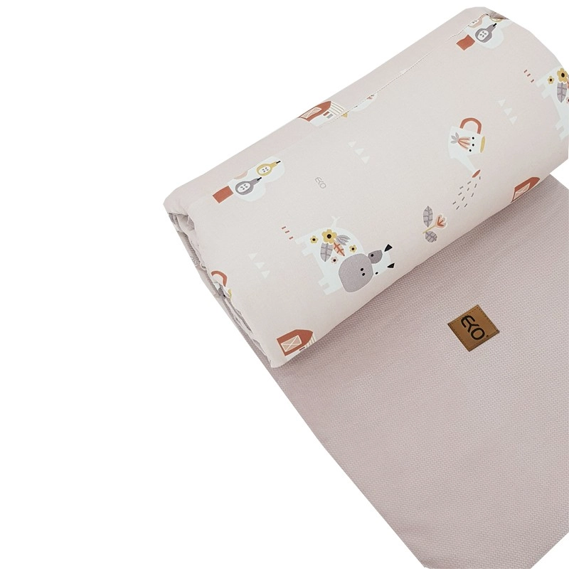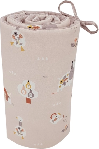 Prinderea cu șnururi permite fixarea ușoară și stabilă pe majoritatea pătuțurilor standard. Dimensiunea de 180 × 35 cm acoperă latura mai lungă și o parte din latura scurtă a pătuțului sau trei segmente mai scurte, după nevoie. Nuanța delicată roz pudră și motivele My Farm se asortează frumos cu restul accesoriilor din camera copilului.