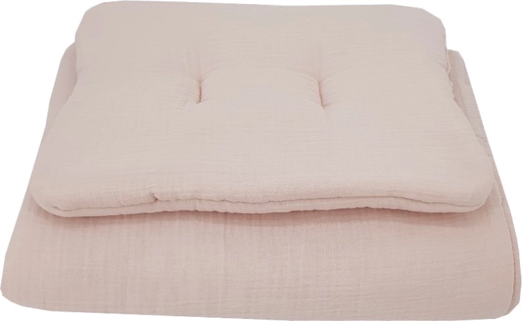 Oferă bebelușului un somn liniștit cu acest set din muselină pentru pătuț, 2 piese în nuanța delicată powder pink. Muselina din bumbac 100%, ușoară și respirabilă, este extrem de fină la atingere, elastică și plăcută pentru pielea sensibilă. Setul include o pernă 30 × 40 cm și o pilotă 75 × 100 cm cu umplutură hipoalergenică pentru un somn confortabil și sigur.