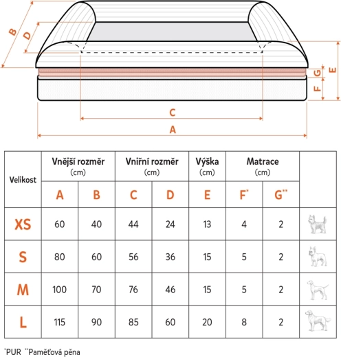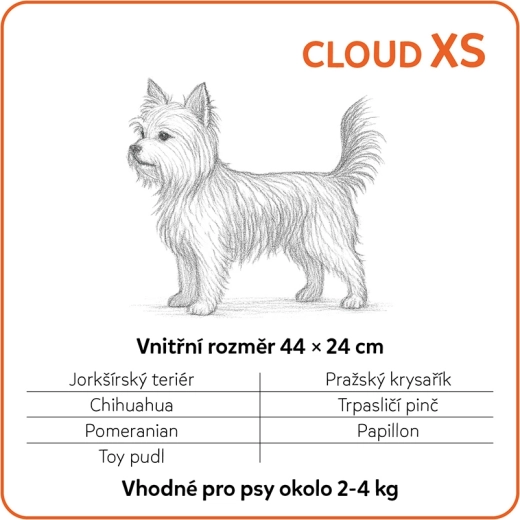 Cloud XS este un pătuț ortopedic confortabil pentru câini mici și pui, care asigură susținerea corectă a corpului chiar și în timpul somnului prelungit. Construcția cu două straturi (4 cm PUR + 2 cm spumă cu memorie CertiPUR-US) distribuie uniform presiunea, absoarbe șocurile și aduce o ușurare vizibilă articulațiilor și coloanei solicitate. Margini laterale înalte (13 cm) susțin capul și creează un loc liniștit, confortabil și protejat pentru odihnă.