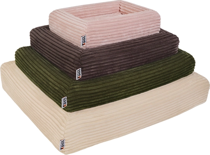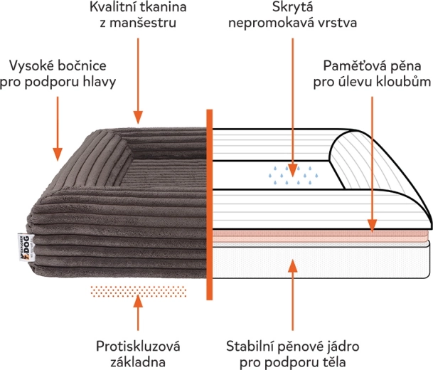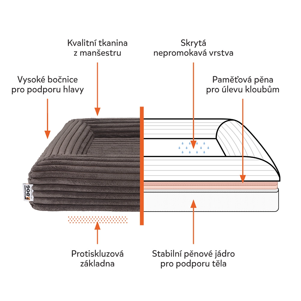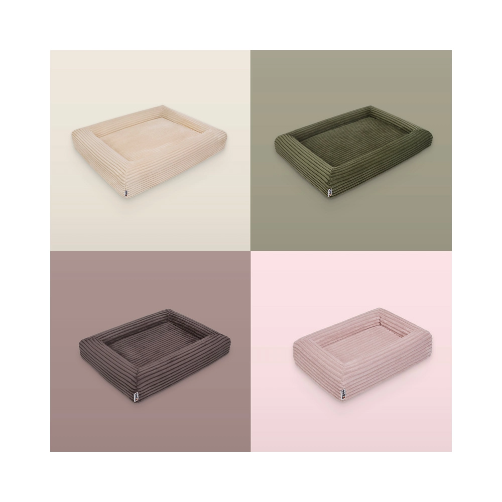 Husa din catifea reiată fină (100% poliester) cu certificare OEKO-TEX Standard 100 este rezistentă, se usucă rapid și absoarbe mai puține mirosuri. Cu ajutorul fermoarelor YKK o puteți îndepărta ușor și spăla la mașină la 30 °C. Stratul interior impermeabil protejează miezul din spumă împotriva umezelii și murdăriei, iar partea inferioară antiderapantă menține pătuțul stabil chiar și pe podele netede.