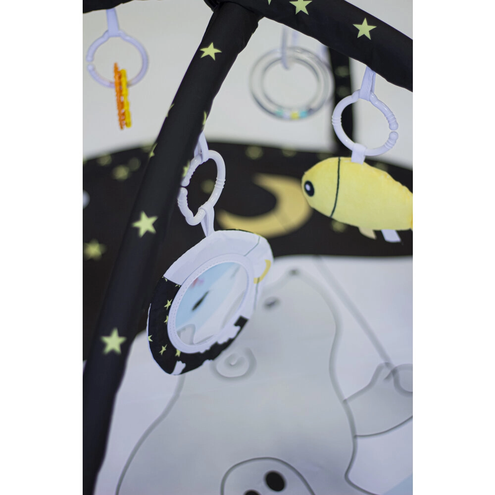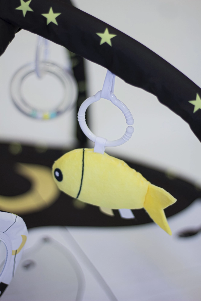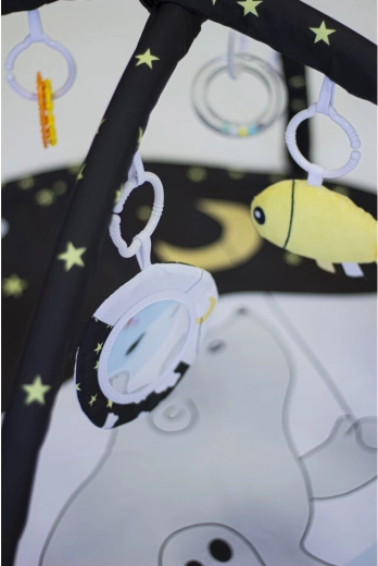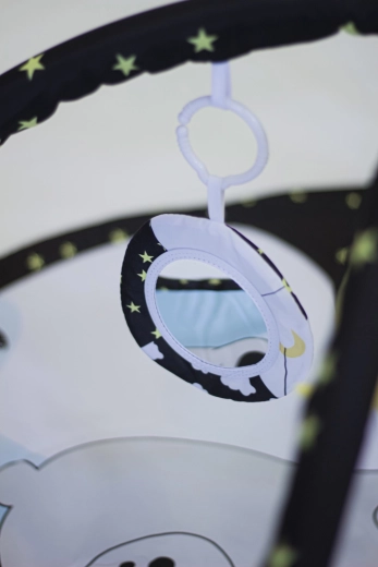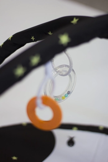 Datorită celor două bare detașabile și celor patru jucării suspendate pe inele C, copilul exersează prinderea, coordonarea mână–ochi și motricitatea. Construcția variabilă permite trei moduri de utilizare: saltea clasică cu bară, saltea cu umbrire și cort tip teepee pentru joc imaginativ.
