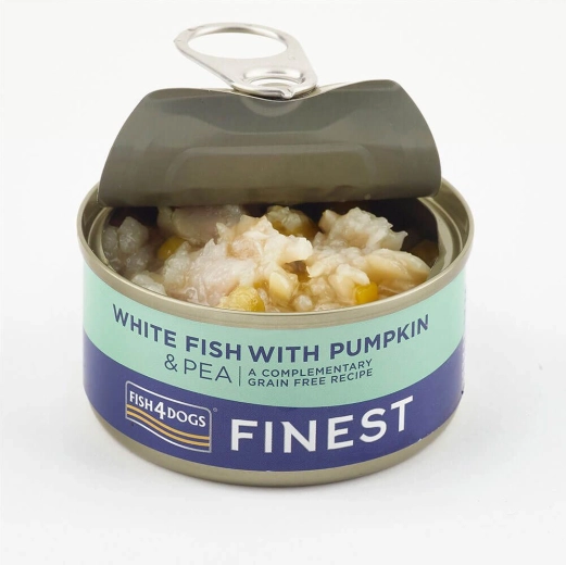 Răsfățați-vă câinele cu o conservă suculentă din pește alb cu dovleac și mazăre. Rețeta are la bază 50% pește alb, sursă naturală de proteine de calitate și conținut scăzut de grăsimi, completată cu dovleac și mazăre pentru o mai bună digestibilitate și gust. Conserva este fără cereale, potrivită și pentru câinii sensibili.