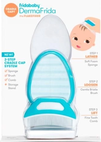 Descoperiți soluția delicată pentru pielea capului bebelușului: FRIDABABY DermaFrida FlakeFixer este un instrument inteligent în 3 pași, care ajută la înmuia, elibera și pieptăna scuamele cauzate de dermatita seboreică. Potrivit de la naștere, cu burete din spumă moale, perie fină și pieptene des. Include suport cu ventuză pentru depozitare igienică.