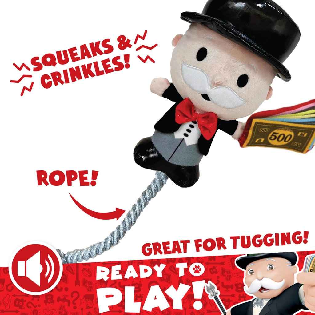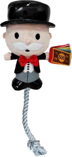 Această jucărie din pluș, licențiată oficial, cu personajul iconic din jocul MONOPOLY, îmbină atingerea moale cu o execuție rezistentă. Este ideală pentru tras, aport și joacă individuală. Datorită combinației de pluș și frânghie împletită, face față unei intensități de utilizare de la ușoară la medie și este plăcută la ros.