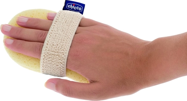 Manușă din burete CHICCO Baby Moments, practică pentru baia zilnică a bebelușului. Oferă curățare delicată a pielii sensibile a copiilor, fixare confortabilă cu bandă elastică și buzunar interior pentru săpun pentru spălare ușoară cu o singură mână.