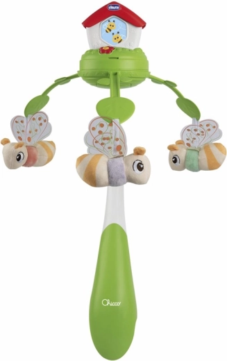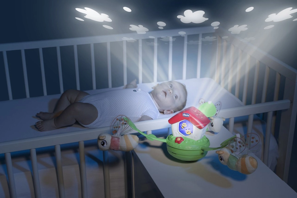 CHICCO Bee Hive 3‑în‑1 crește odată cu copilul tău – de la nou‑născut la toddler. Ca și carusel, creează deasupra pătuțului proiecții luminoase liniștitoare și o rotație delicată a albinelor textile, care susțin percepția vizuală și ajută la adormire. După îndepărtarea brațului, funcționează ca proiector independent lângă pătuț, iar mai târziu se transformă într‑un centru de activități – bebelușul se poate juca cu albinele și stupul detașabile.