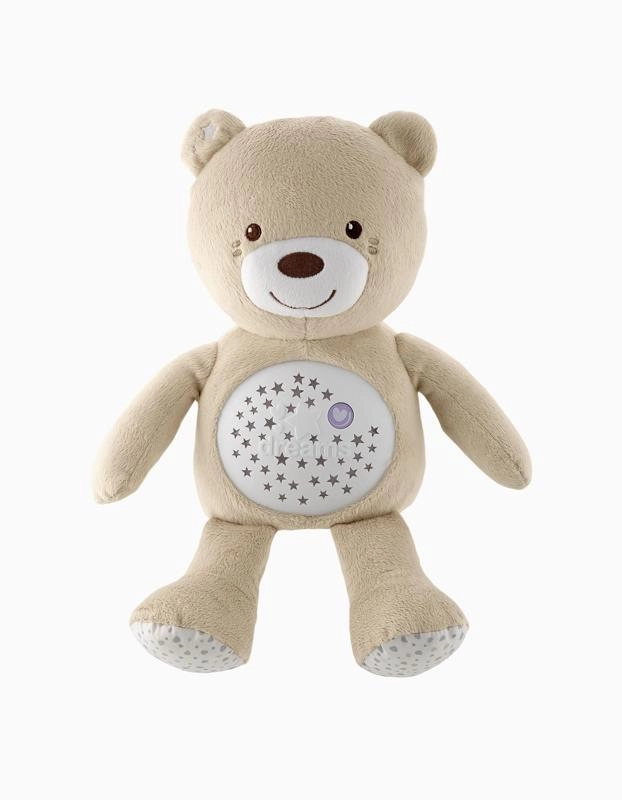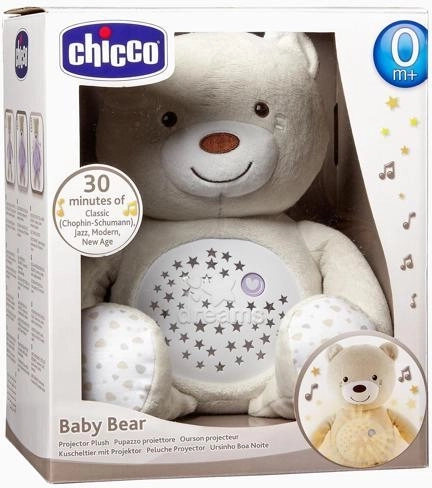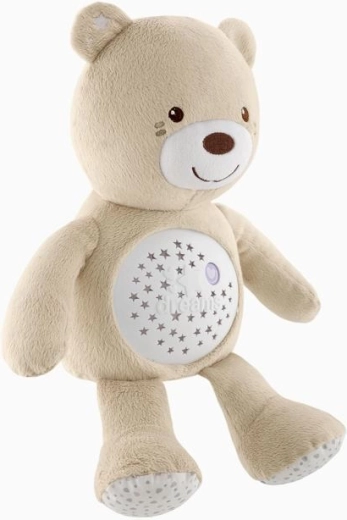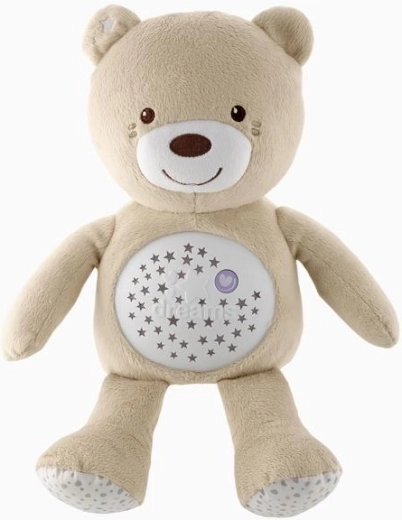 Adorabilul ursuleț de pluș Chicco Baby Bear First Dreams liniștește bebelușul cu lumină delicată și melodii. Oferă proiecție a cerului nopții, lampă de noapte cu intensitate reglabilă și până la 30 de minute de muzică, inclusiv clasică, jazz, soft rock, melodii moderne, new age și zgomot alb. Este moale, lavabil după îndepărtarea modulelor electronice și potrivit de la naștere.