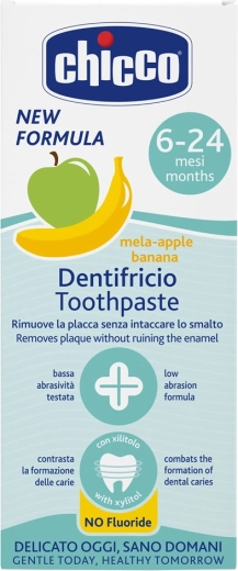 Pasta de dinți delicată pentru copii CHICCO cu aromă de măr și banană este concepută special pentru copiii de la 6 la 24 de luni. Datorită conținutului de xilitol ajută la prevenirea cariilor dentare, în timp ce formula blândă cu abrazivitate scăzută nu deteriorează dinții de lapte. Nu conține fluor și susține o rutină plăcută de igienă orală zilnică.
