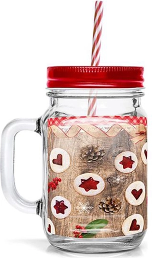 Bucurați-vă de limonadele preferate, ice tea sau băuturi mixate cu stil. Paharul patrulater cu mâner și capac metalic cu filet păstrează băutura în siguranță și, datorită garniturii, minimizează riscul de vărsare. Sticla transparentă este decorată cu un model jucăuș de fursecuri Linzer, care creează o atmosferă festivă și atrage privirile pe orice masă.