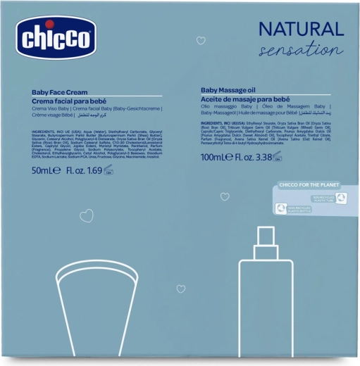 Descoperiți îngrijirea delicată pentru pielea sensibilă a bebelușilor cu setul cadou CHICCO Natural Sensation We Are Two pentru nou-născuți. Setul conține ulei de masaj 100 ml și cremă pentru față 50 ml, care oferă hrănire, protecție și hidratare pe tot parcursul zilei. Formula este aprobată de pediatri și dermatologi, respectă pH-ul natural al pielii și este ideală pentru ten uscat și sensibil.