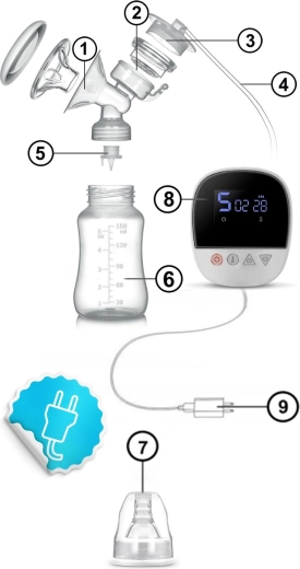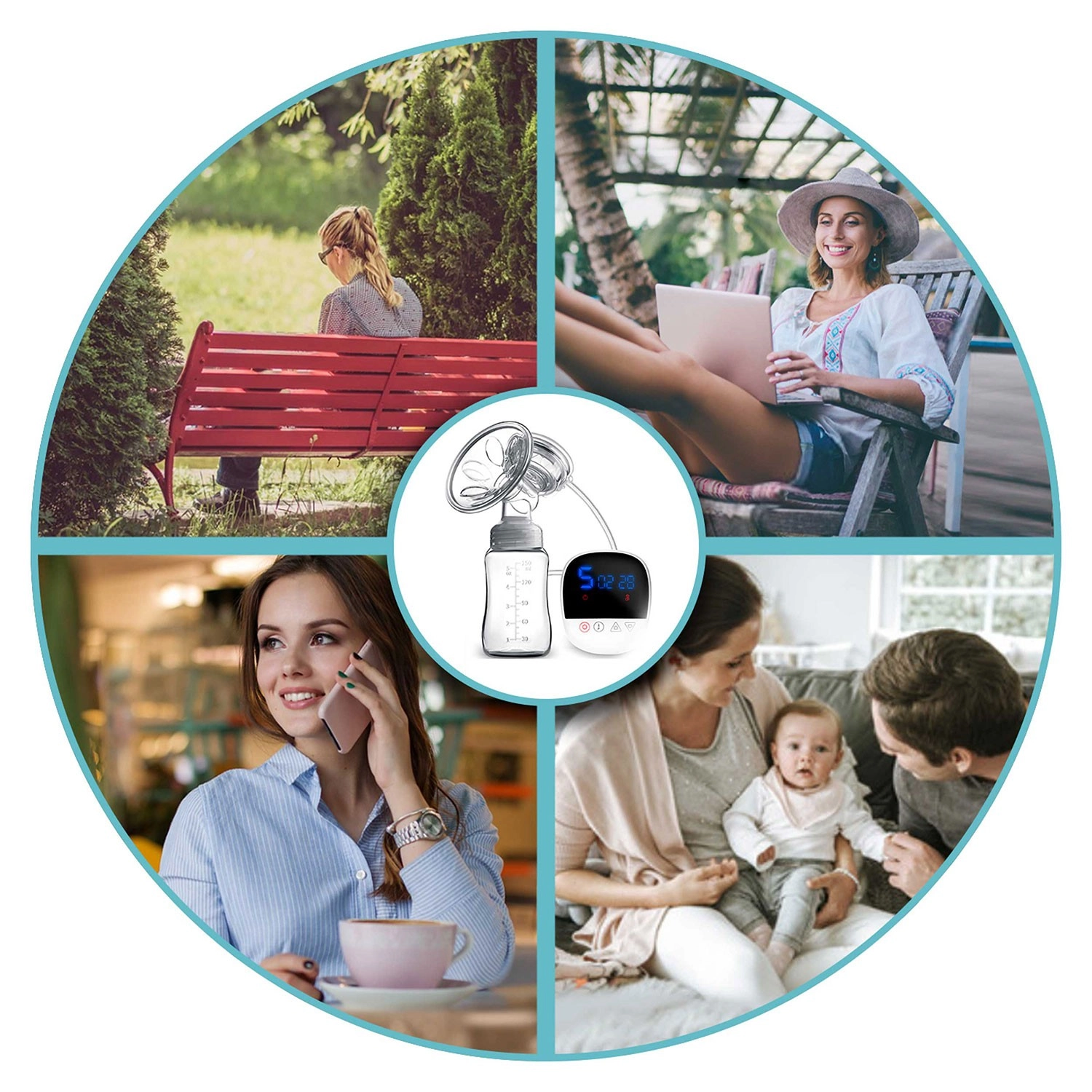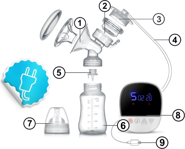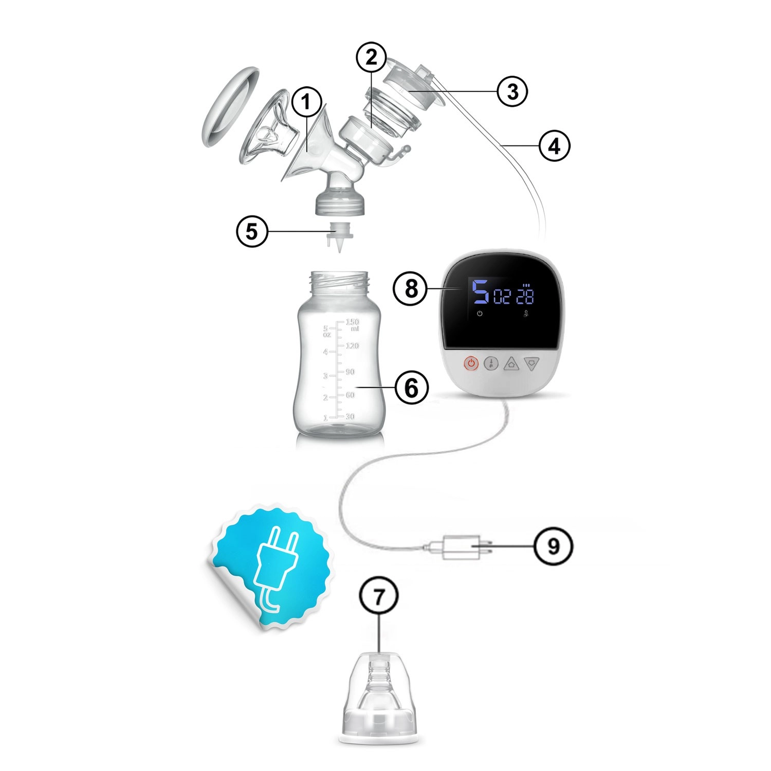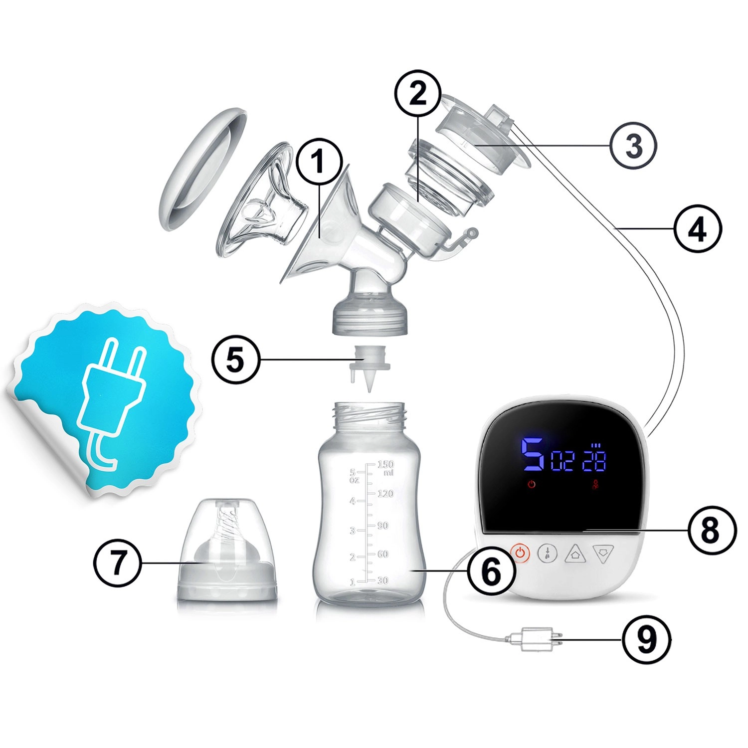 Dispozitivul este fără fir, cu baterie rezistentă, foarte silențios și ideal pentru călătorii. Panoul intuitiv cu ecran afișează timpul, modul, nivelul de aspirație și starea bateriei. Toate componentele care intră în contact cu laptele sunt fără BPA și respectă standardele CE, LFGB, RoHS, REACH. Demontarea rapidă și curățarea ușoară simplifică igiena zilnică și mențin standarde înalte de siguranță pentru tine și bebelușul tău.