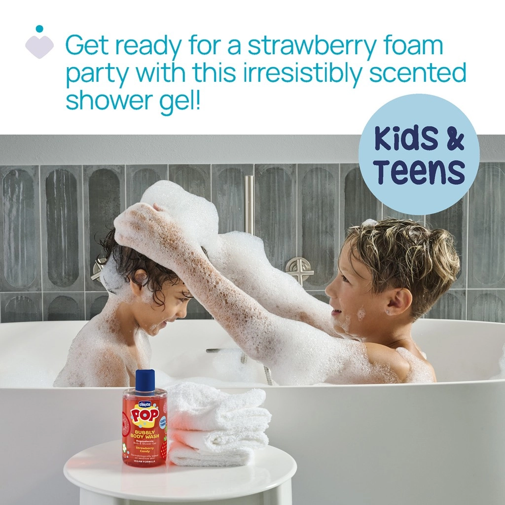 Chicco POP Strawberry Candy transformă fiecare duș într-un ritual parfumat, plin de bucurie. Textura ușoară, bogat spumoasă curăță delicat și lasă pielea catifelată și plăcut parfumată cu o aromă dulce de căpșuni, pe care copiii și adolescenții o vor adora.