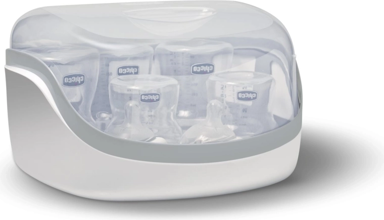 Sterilizare rapidă și sigură a biberoanelor și accesoriilor în câteva minute direct la microunde. Acest sterilizator compact CHICCO poate găzdui până la 5 biberoane și elimină până la 99,9% din bacterii fără substanțe chimice. Este ușor și compact, ideal acasă și în călătorii, iar cu capacul închis menține conținutul steril până la 24 de ore.