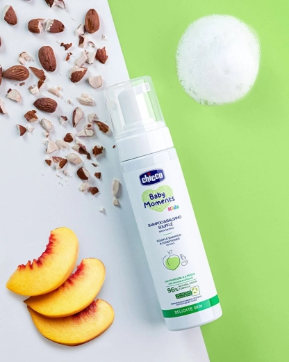 Descoperă îngrijirea pe care copiii o vor iubi – spuma aerată și parfumată CHICCO Baby Moments Kids Soufflé 2în1 spală delicat și, în același timp, facilitează pieptănarea. Datorită combinației de extracte de migdală și piersică, părul copiilor rămâne fin, neted și frumos strălucitor. Nu ustură ochii și respectă pielea sensibilă a copiilor.