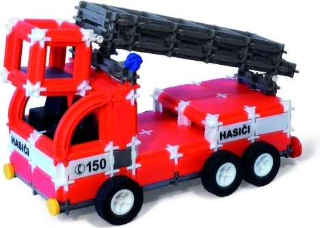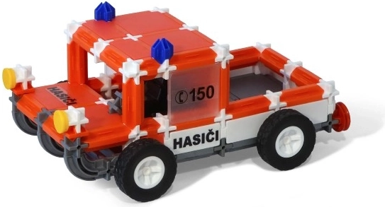 Construiește un autovehicul de pompieri cu platformă ridicătoare, o cisternă mare cu posibilitate de rotație și un vehicul de comandă (tehnic). Nu lipsesc autocolantele tematice „HASIČI, RESCUE, FIRE” și numărul liniei de urgență 150, care îi ajută pe copii să învețe principii importante de siguranță.