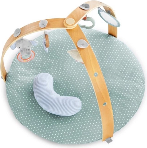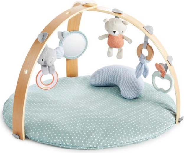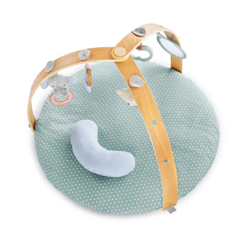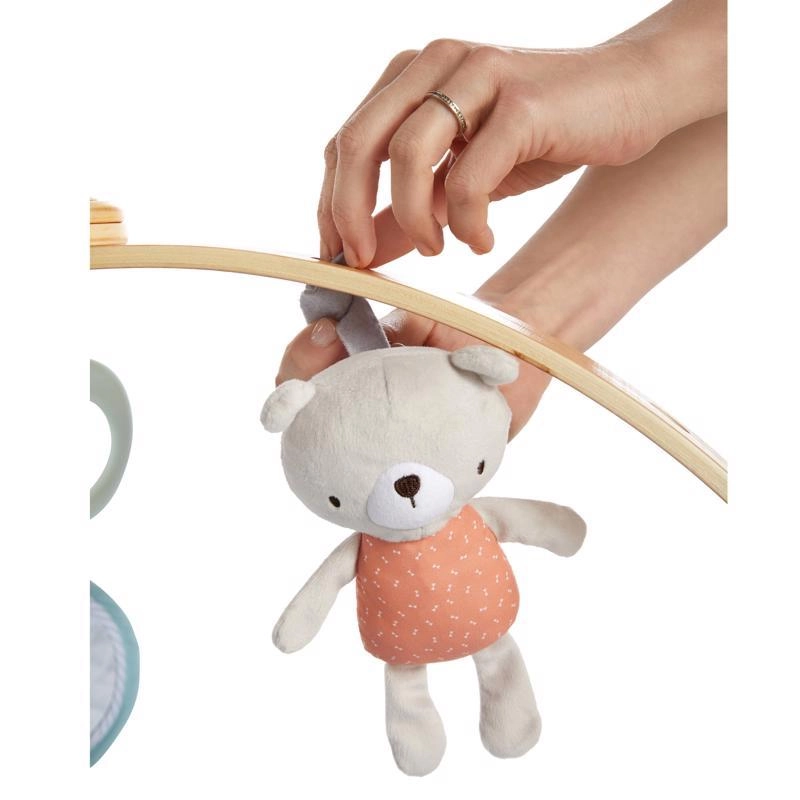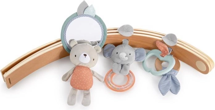 Două arcade încrucișate cu stil lemnos, împreună cu animăluțe moi, jucării de dentiție și oglindă de siguranță, stimulează văzul, simțul tactil și primele prinderi.