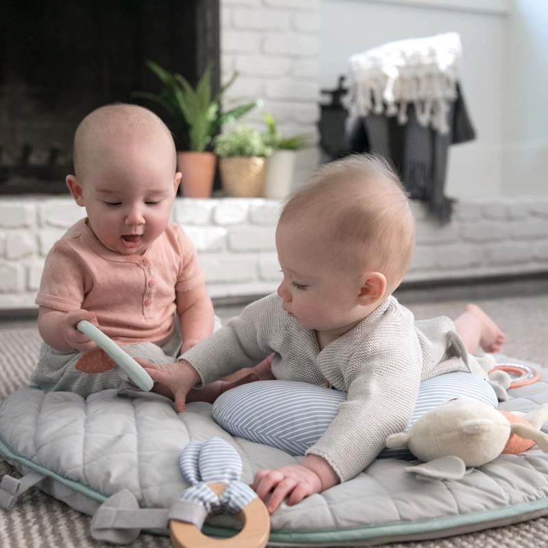 Covorașul de joacă Loamy transformă orice colțișor al casei într-un spațiu de joacă primitor și stilat încă din prima zi. Salteluța moale, dublu-față, cu model delicat, și cele două arcade încrucișate cu aspect natural de lemn atrag privirea, în timp ce jucăriile suspendate, jucăria de dentiție și oglinda de siguranță îl motivează pe bebeluș să se întindă, să prindă și să își descopere reflexia.