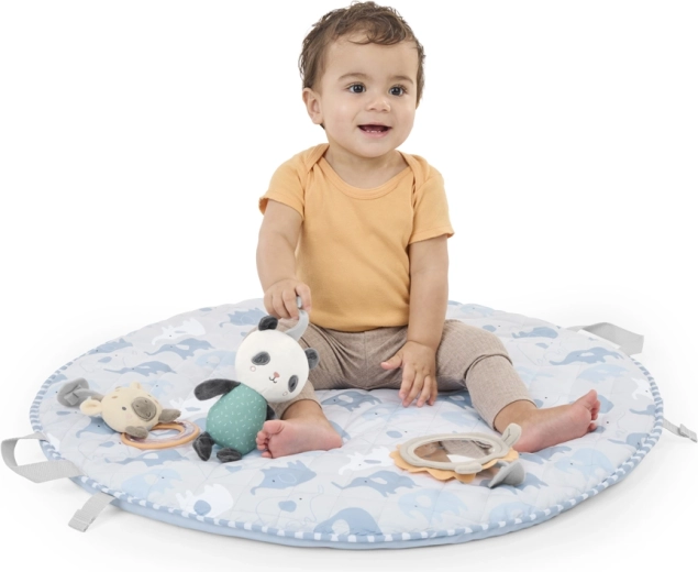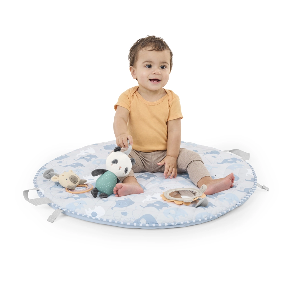 Practică zi de zi: bara SlimFold se rabatează ușor, păturica se pliază într-o „geantă” compactă datorită mânerelor integrate, iar husele se spală simplu la mașină. Materialele sigure și elementele senzoriale concepute inteligent (oglinjoară, zornăitoare, inel de dentiție, inel din lemn, pluș) trezesc curiozitatea și susțin joaca liniștită.