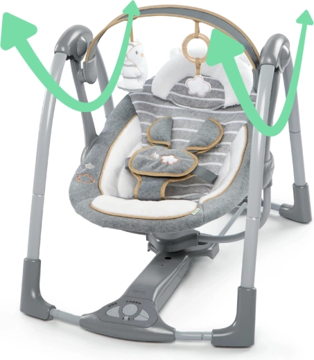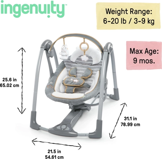 Liniștește bebelușul cu o legănare delicată oriunde, în călătorii. Leagănul portabil Ingenuity Swing’n Go, design Bella Teddy, oferă structură pliabilă compactă, 5 viteze de legănare, 8 melodii și 3 sunete din natură și motor silențios pentru odihnă liniștită. Textile premium moi, suport de cap detașabil și centură căptușită în 5 puncte asigură confort și siguranță de la naștere până la 9 kg.