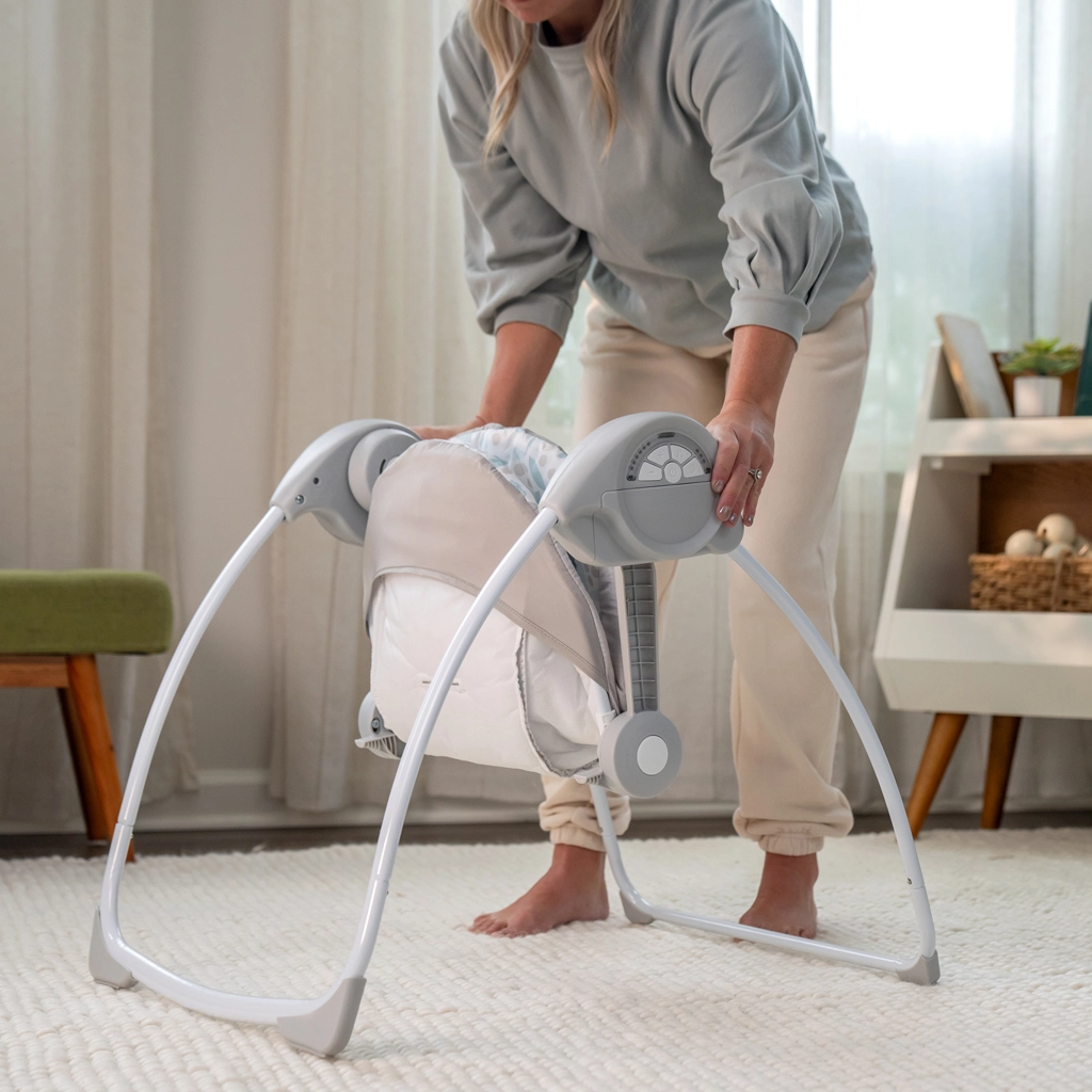 Leagăn practic și portabil pentru nou-născuți până la 9 kg, care oferă o legănare fină și liniștitoare, muzică plăcută și jucării distractive pentru stimulare vizuală și auditivă. Tehnologia WhisperQuiet™ asigură funcționare silențioasă, astfel încât nimic să nu perturbe somnul sau timpul de relaxare. Datorită designului pliabil compact, îl poți lua oriunde – la bunici, la casă de vacanță sau într-un apartament mic.