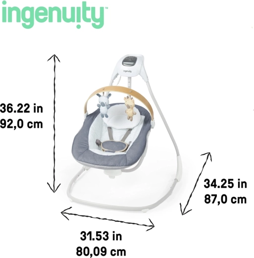 Ingenuity SimpleComfort Chambray este un leagăn pentru copii conceput cu grijă, care combină confortul, siguranța și distracția într-un singur produs. Scaunul rotativ la 180° permite legănare în trei direcții, astfel încât ajustezi ușor mișcarea și orientarea către părinte. Tehnologia TrueSpeed menține viteza de legănare aleasă în funcție de greutatea copilului, iar motorul WhisperQuiet asigură o funcționare cât se poate de silențioasă.