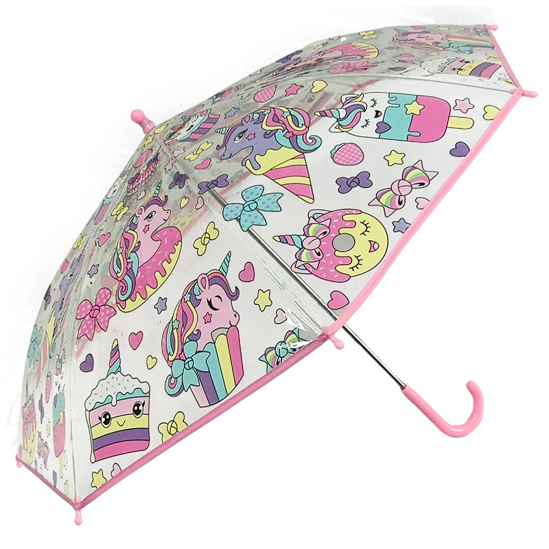 Umbrela transparentă pentru copii, cu motiv de unicorni, îi protejează de ploaie și le permite totodată să vadă confortabil drumul. Datorită construcției ușoare și manevrării simple, este potrivită chiar și pentru cei mici. Design transparent, motiv îndrăgit cu unicorni și deschidere ușoară o fac accesoriul ideal pentru grădiniță și pentru călătorii.