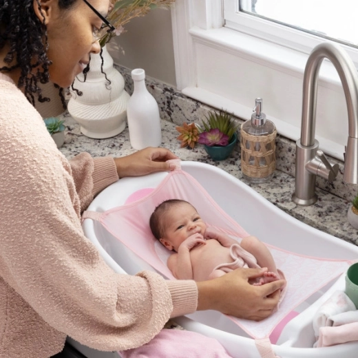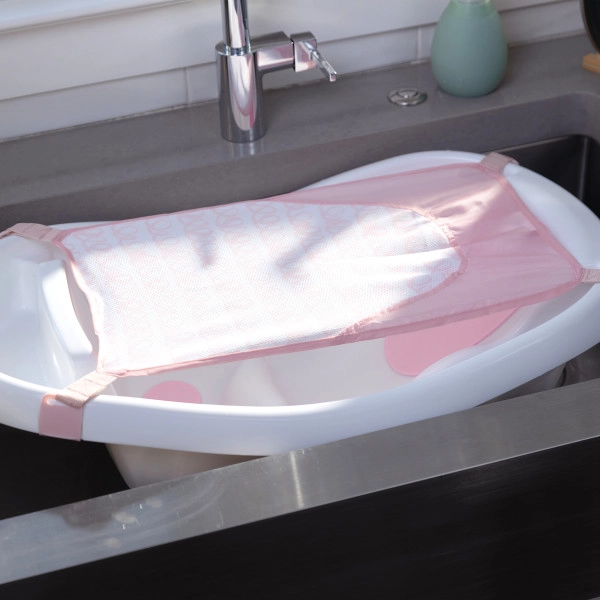 Hamacul textil moale și respirabil sprijină delicat bebelușul și vă eliberează mâinile pentru spălare confortabilă și sigură. Ideal pentru primele luni, până când copilul poate sta în șezut singur.