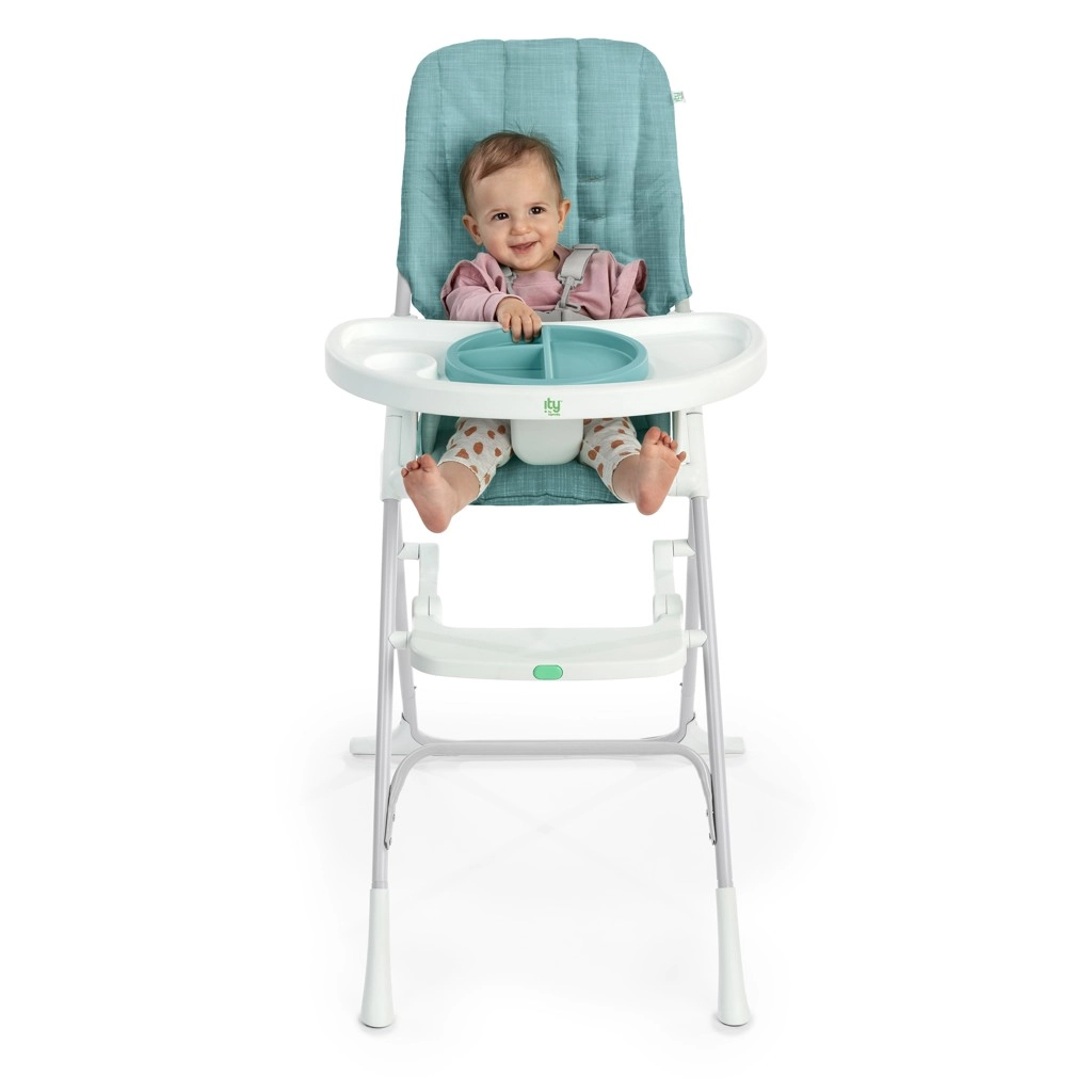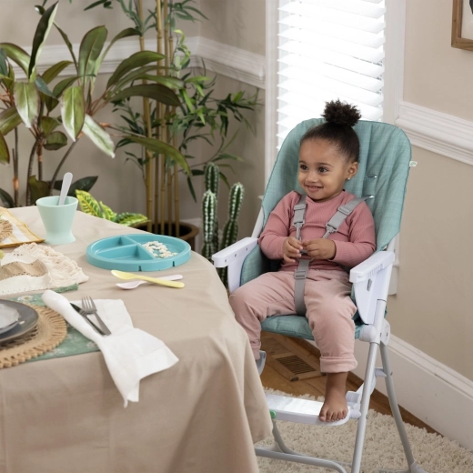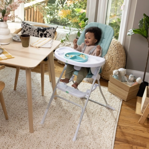 INGENUITY Sun Valley este o alegere inteligentă pentru mesele zilnice și pentru primele încercări de auto-hrănire la masă. Scaunul se pliază plat în câteva clipe și în stare pliată stă singur, ceea ce îl face ușor de depozitat și transportat. Tapițeria moale se poate spăla la mașină, iar tăvița mare cu reglare în 3 trepte se prinde pe spătar pentru economisirea spațiului.