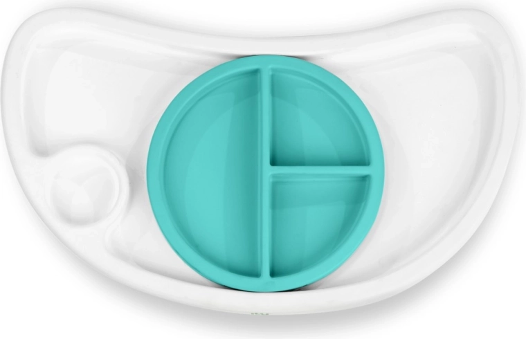 Farfuria cu trei compartimente se blochează în siguranță în tăviță, astfel încât copilul să nu o poată arunca. Este potrivită pentru cuptorul cu microunde și susține porționarea și servirea organizată.