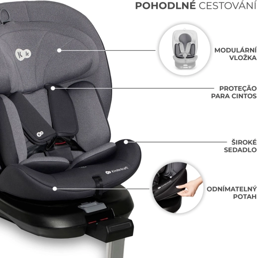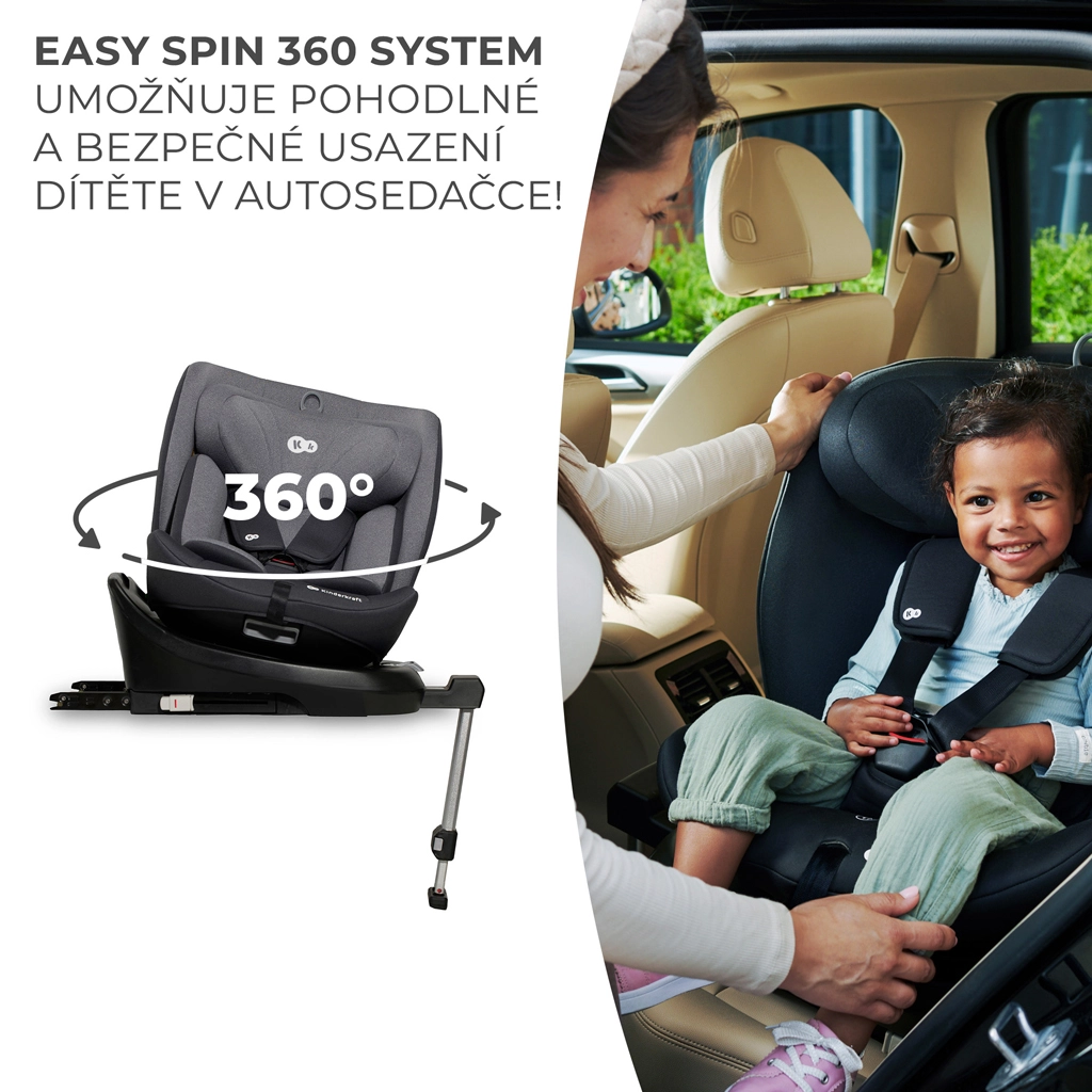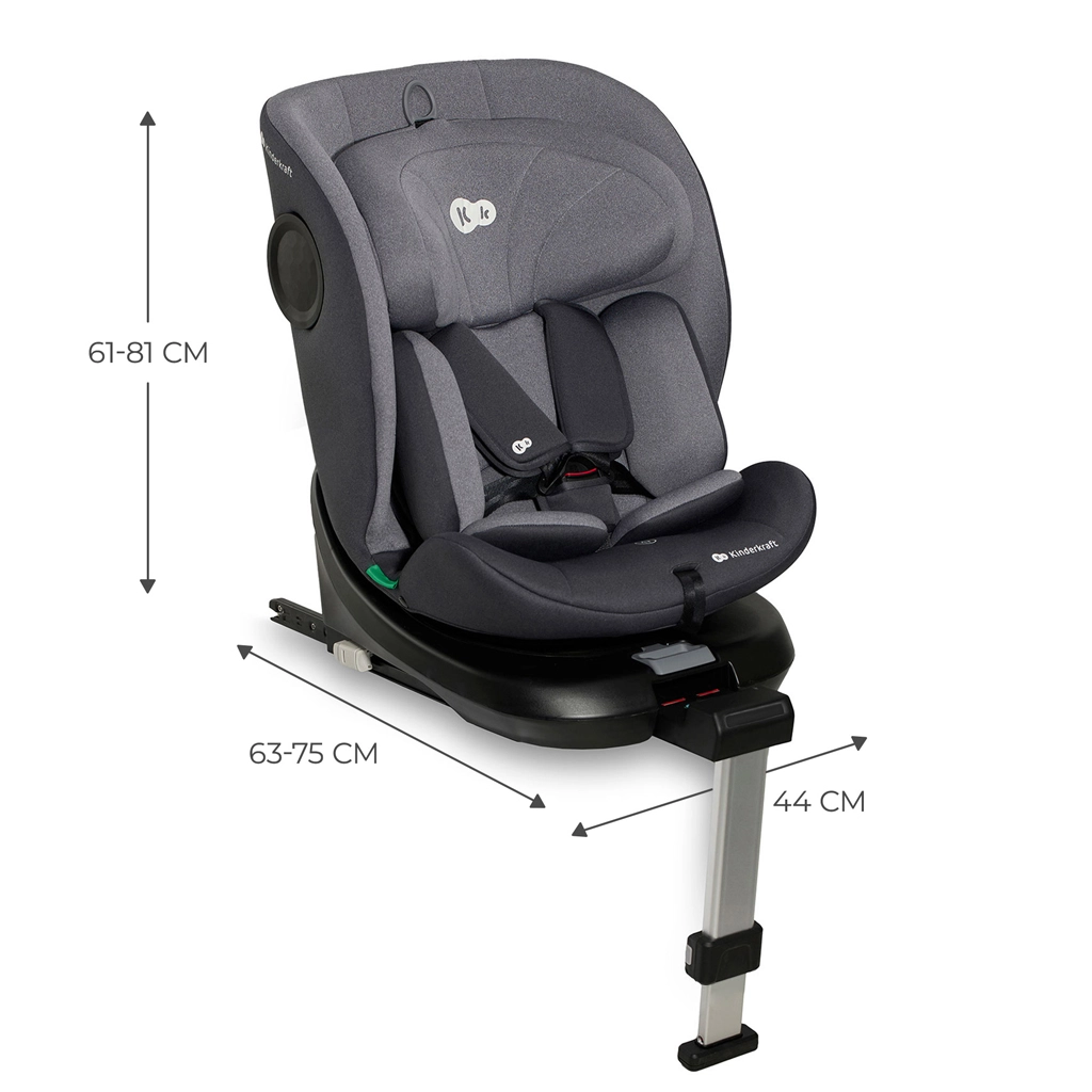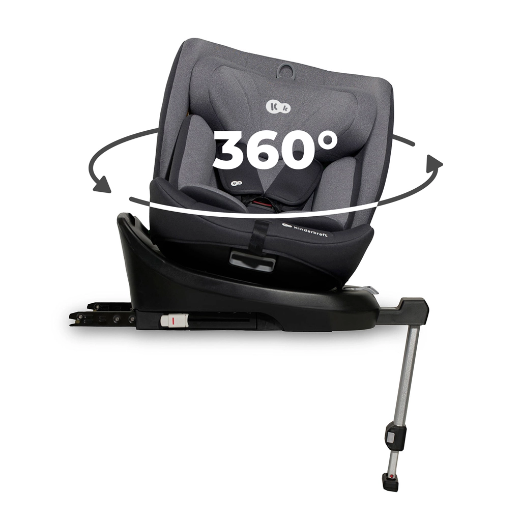 Scaunul auto rotativ KINDERKRAFT I-360 i-Size pentru înălțimea copilului 40–150 cm oferă siguranță și confort maxime de la naștere până la aproximativ 12 ani. Oferă RWF până la 4 ani, sistem rotativ 360° pentru așezare ușoară, ISOFIX cu indicatori de instalare corectă și picior de sprijin. Protecția este îmbunătățită de H-GUARD și SIDE PROTECT SYSTEM+, în timp ce tetiera cu 12 poziții, 5 poziții de înclinare și inserțiile moi cu spumă cu memorie asigură confort la fiecare drum.