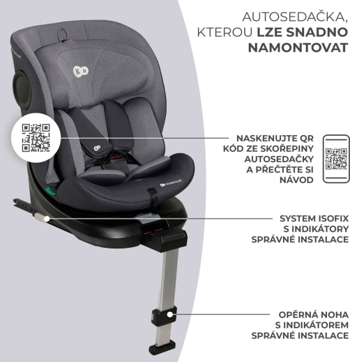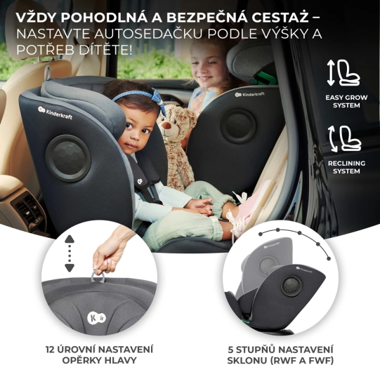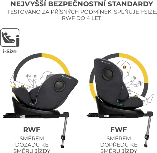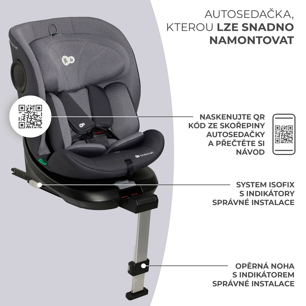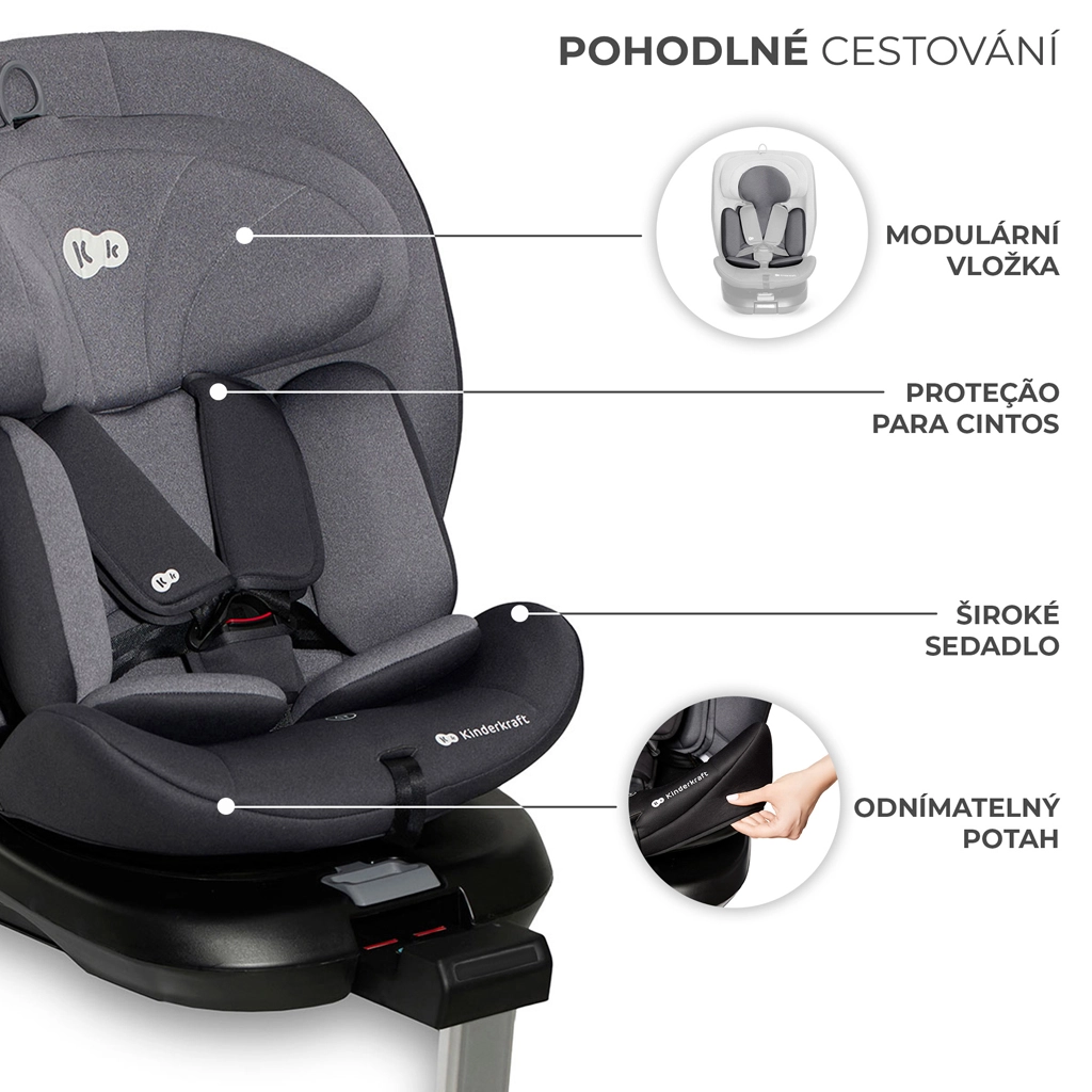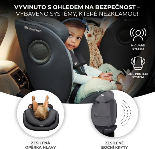 Scaunul auto rotativ KINDERKRAFT I-360 i-Size pentru înălțimea copilului 40–150 cm oferă siguranță și confort maxime de la naștere până la aproximativ 12 ani. Oferă RWF până la 4 ani, sistem rotativ 360° pentru așezare ușoară, ISOFIX cu indicatori de instalare corectă și picior de sprijin. Protecția este îmbunătățită de H-GUARD și SIDE PROTECT SYSTEM+, în timp ce tetiera cu 12 poziții, 5 poziții de înclinare și inserțiile moi cu spumă cu memorie asigură confort la fiecare drum.