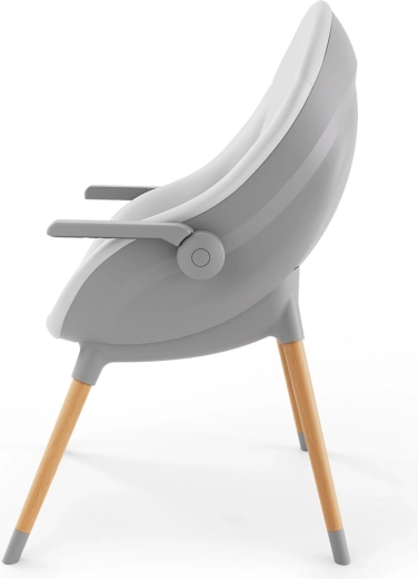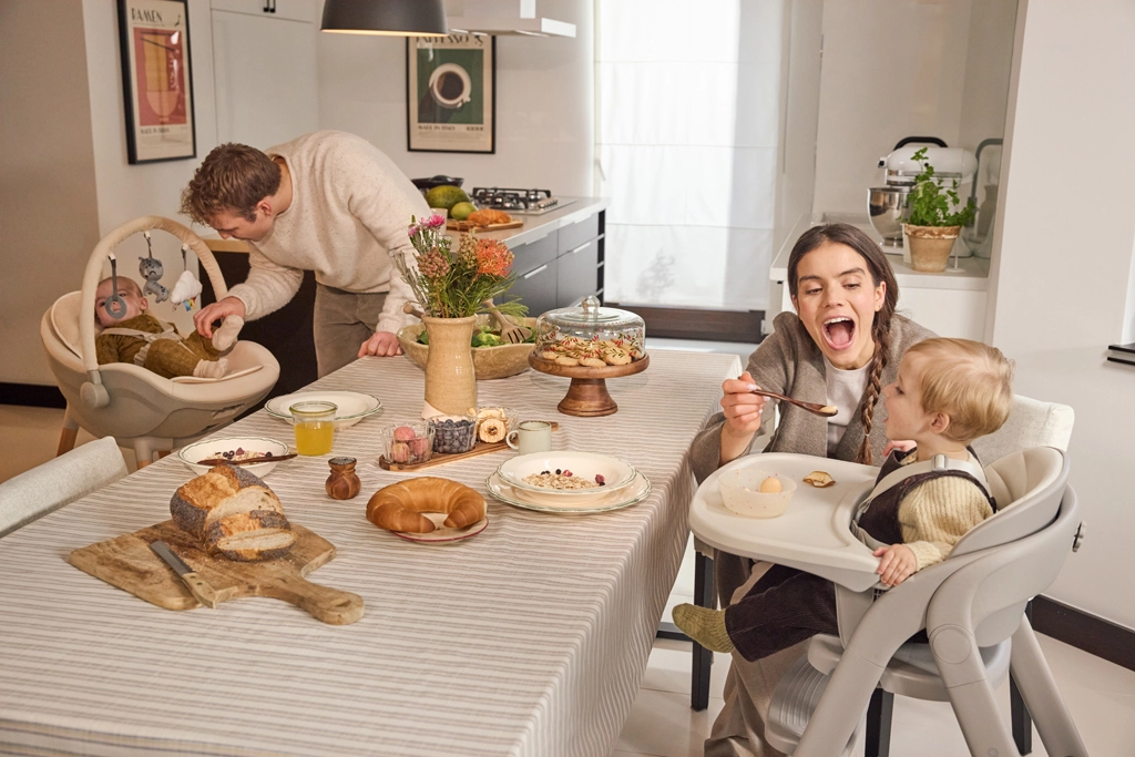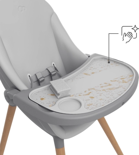 Practicitatea merge mână în mână cu estetica: picioare din fag, culori atenuate și materiale moi se integrează în interior, în timp ce tăvița dublă permite curățenie rapidă după masă. Centurile în 5 puncte, capetele antiderapante ale picioarelor și centrul de greutate jos asigură siguranță chiar și în momentele mai dinamice. Arcada cu trei jucării oferă distracție, iar insertul moale pentru nou-născuți asigură confortul celor mici.